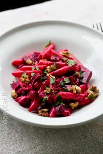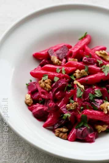 Svogūną smulkiai supjaustyti ir pakepti kaitintame aliejuje. Kai svogūnas suminkštės, supilti grietinėlę, sudėti ketvirčiais ar smulkiau (priklauso nuo dydžio) pjaustytus burokėlius, pagardinti druska, pipirais ir užvirti. Tada sumaišyti su virtais makaronais, pabarstyti riešutais bei smulkintomis žolelėmis.