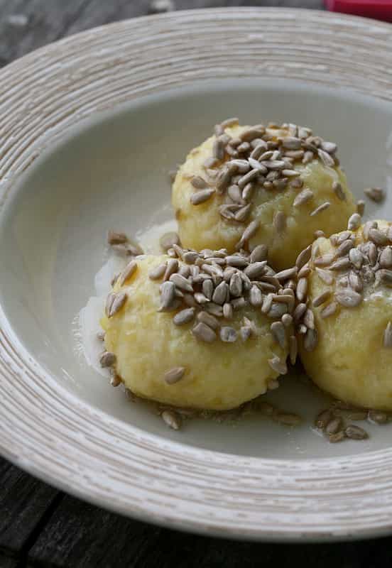 Bulves išvirkite, dar karštas sūgrūskite arba sumalkite. Atvėsinkite, suberkite miltus, krakmolą, įmuškite kiaušinį, žiupsnelį druskos ir viską gerai išmaišykite. Sudrėkintomis rankomis formuokite paplotėlius, įdėkite fetos sumaišytos su smulkintomis petražolėmis ir formuokite kukulius. Kukulius dėkite į verdantį pasūdytą vandenį ir virkite apie 8-10 minučių. Išgriebkite kiaurasamčiu. Prieš tiekiant užpilkite tirpinto sviesto ir pabarstykite kepintomis saulėgrąžomis.