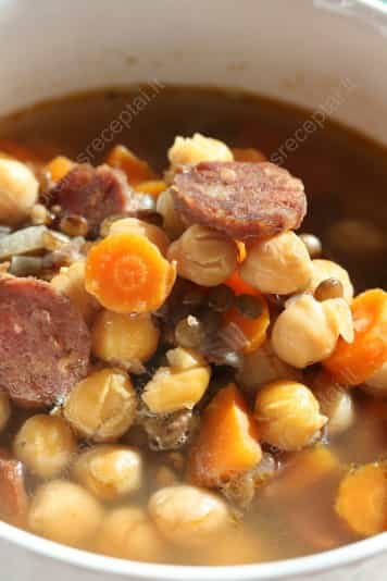 Įkaitinti aliejų ir jame apkepti svogūnus, kol pradės minkštėti, sudėti morkas ir dar kelias minutes pakepti, suberti paprikos miltelius, čili dribsnius, chorizo ir dar minutę maišant pakepti. Sudėti lęšius, avinžirnius, sultinį ir užvirti. Virti apie 20-25 minutes, kol lęšiai ir daržovės bus minkšti. Prieš tiekiant, pabarstyti petražolių lapeliais.