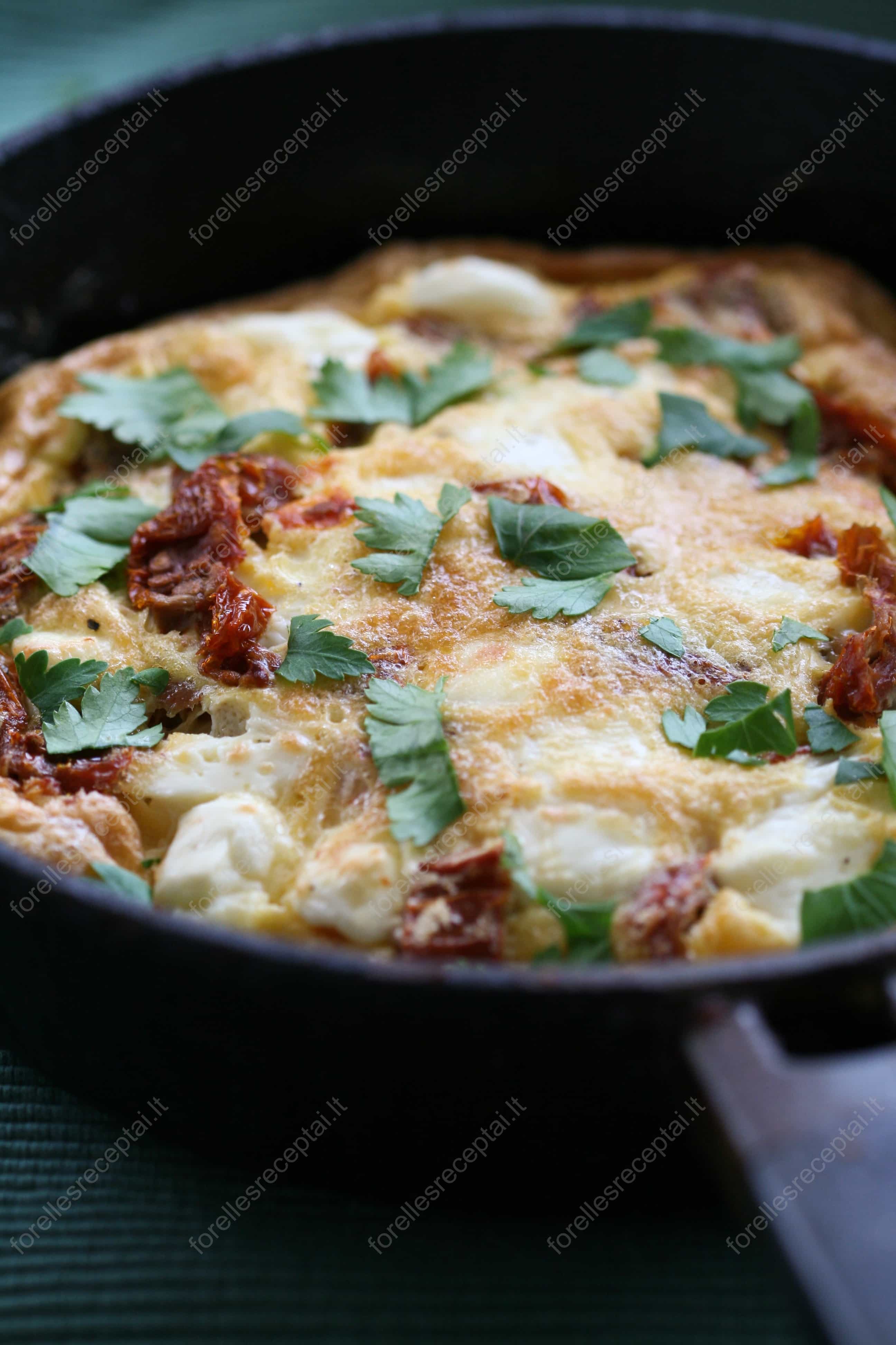 Nedidelėje keptuvėje įkaitinti sviestą ar aliejų. Supilti gerai išplaktus kiaušinius, pabarstyti smulkintais pomidorais, sūriu, juodaisiais pipirais. Kepti apie 2-4 minutes ant nedidelės ugnies, kol apačia pradės ruduoti. Tada keptuvę 3-4 minutėms kišti po įkaitintu griliu. Apibarstyti smulkintomis petražolėmis ir patiekti.