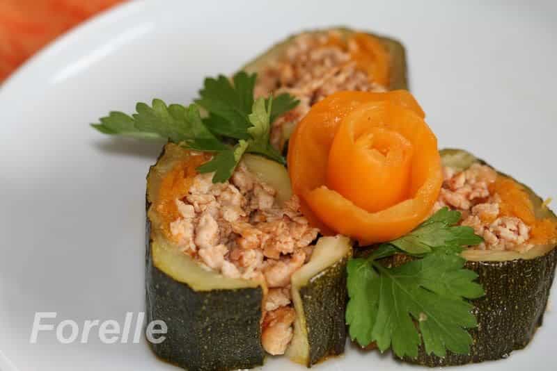 Morkas sutarkuoti burokine tarka ir patroškinti. Išskobtos cukinijos vidų