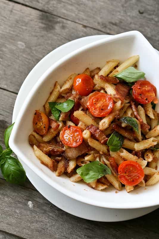 Balandžio mėnesį Languotą prijuostę ryšėjo Dovilė iš Bajalių šeimynos ir jos skelbta tema buvo “Makaronai”. Makaronus labai mėgstu, tai maniau tikrai nebus problemų sudalyvauti, bet… pasirodo balandį jų ir iš jų nieko negaminau. Visa šeimyna mėgsta makaronus, gaminam juos ir namie, turiu tam tikslui įsigijus ir makaronų gaminimo mašinėlę, mėgstu paeksperimentuoti, darau ne tik ne tik tradicinius, bet kiek kitokius makaronus – su dilgėlėmis ar šokoladu. Pirktiniai irgi nenurašomi, juk tokių įvairių formų tikrai nepasigaminsi, o ir patiekalų paruošimas tokiu atveju užtrunka greičiau. Šiems makaronams su šonine ir pomidorams paruošti netruksite nė pusvalandžio, o patiekalas tikrai sotus, jame susipina sūrumas ir saldumas, sunkumas ir gaivumas. Džiūvesėliai puikiai suriša visus ingredientus į bendrą krūvą, todėl jų nepamirškite įberti. Aš šįkartą naudojau mini penne makaronus ir vynuoginius pomidorus.