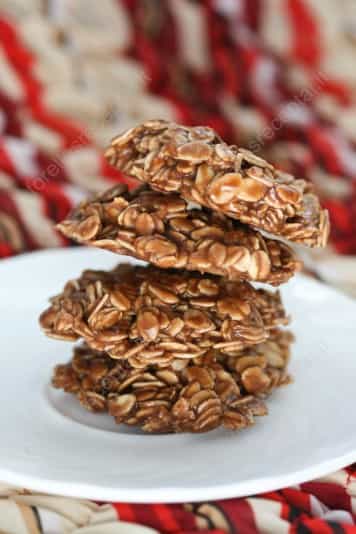 Pirmus keturis ingredientus sudėti į puodą ir maišyti, kol sviestas bei cukrus ištirps. Užvirus pavirti apie vieną minutę. Nukėlus nuo ugnies kelias minutes pavėsinti, sudėti žemės riešutų sviestą ir gerai išmaišyti. Įmaišyti dribsnius. Krėsti šaukštu ant kepimo popieriumi išklotos skardos ar padėklo ir leisti sutvirtėti. Laikyti šaldytuve arba vėsioje vietoje.