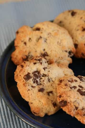Sviestą ar margariną išsukti su cukrumi iki vientisos masės, įmušti kiaušinį, suberti vanilinį cukrų ir gerai išmaišyti. Suberti persijotus miltus, sumaišytus su kepimo milteliais. Išmaišyti, kol neliks sausų produktų. Vėliausiai įmaišyti smulkintą šokoladą. Imti tešlą šaukštu ir dėti ant kepimo popieriumi išklotų skardų. Kepti 190 C temperatūroje 10-12 minučių.
