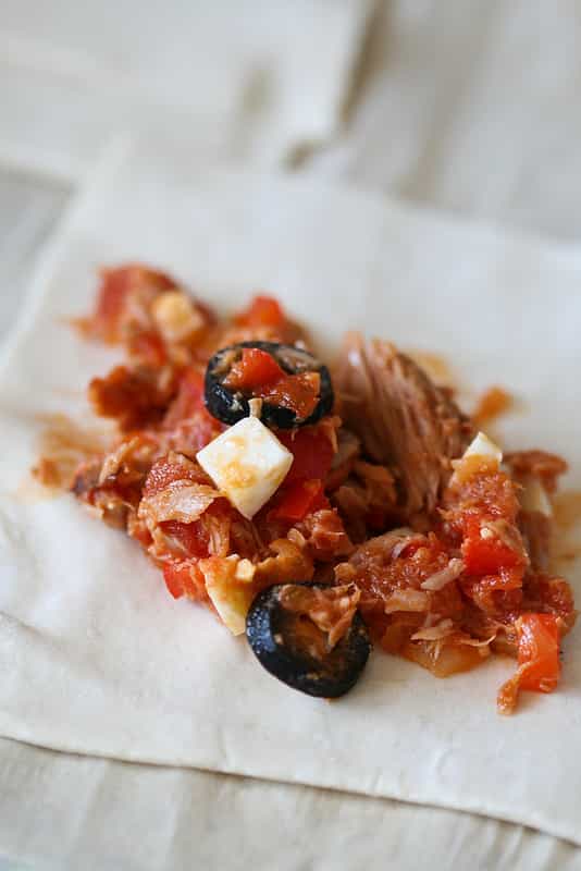 Sluoksniuotos tešlos trikampėliai su daržovių ir tuno įdaru