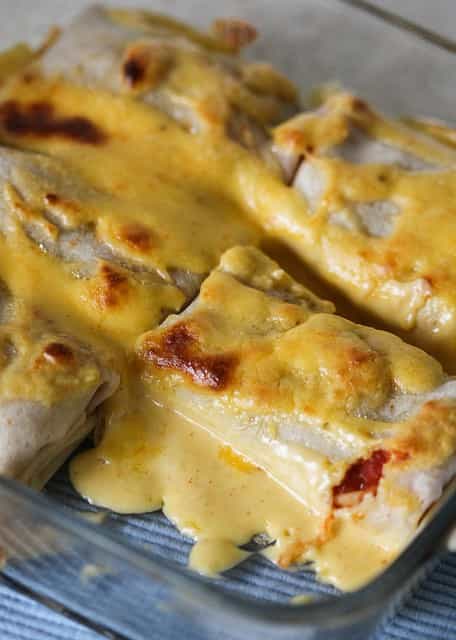 Į lietinius dėkite po šaukštą įdaro, susukite ir gražiai išdėliokite sviestu pateptame inde, tolygiai paskirstykite padažą ir kepkite 180 0C įkaitintoje orkaitėje 13-16 minučių.