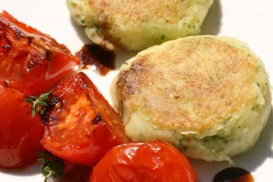 Virtų bulvių paplotėliai su keptais pomidorais